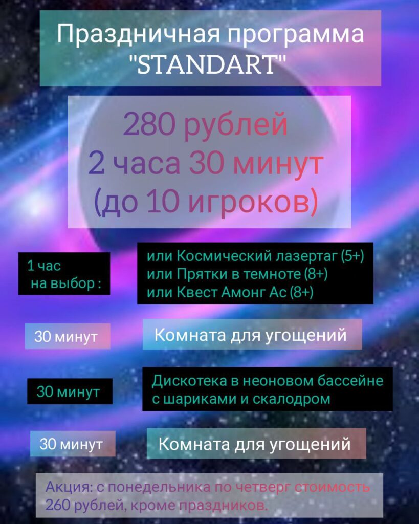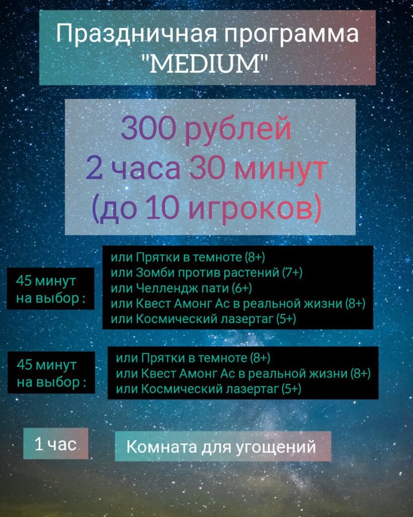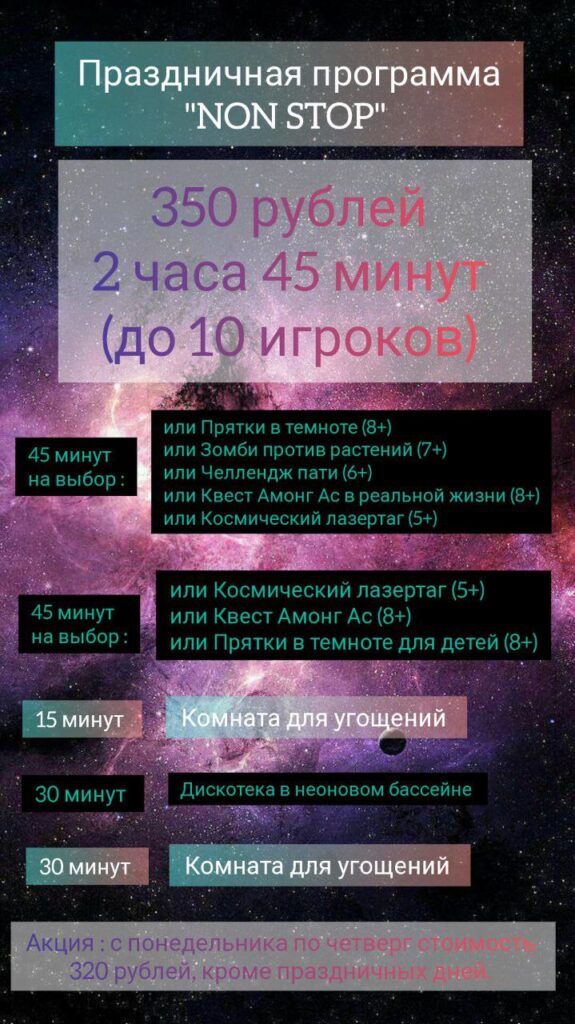 Предлагаем варианты праздничной программы детского дня рождения (до 10 игроков) и выпускных (от 10 до 26 игроков)